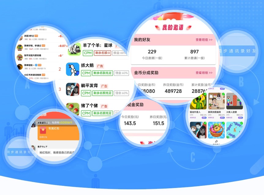 多样化赚钱模式,做悬赏任务,微信小游戏看广告,每日任务,抢红包,收徒赚钱,玩游戏领红包,创新合作方案,保证雇主和赚客公平公正实现互利共赢,更多功能等你来体验吧!